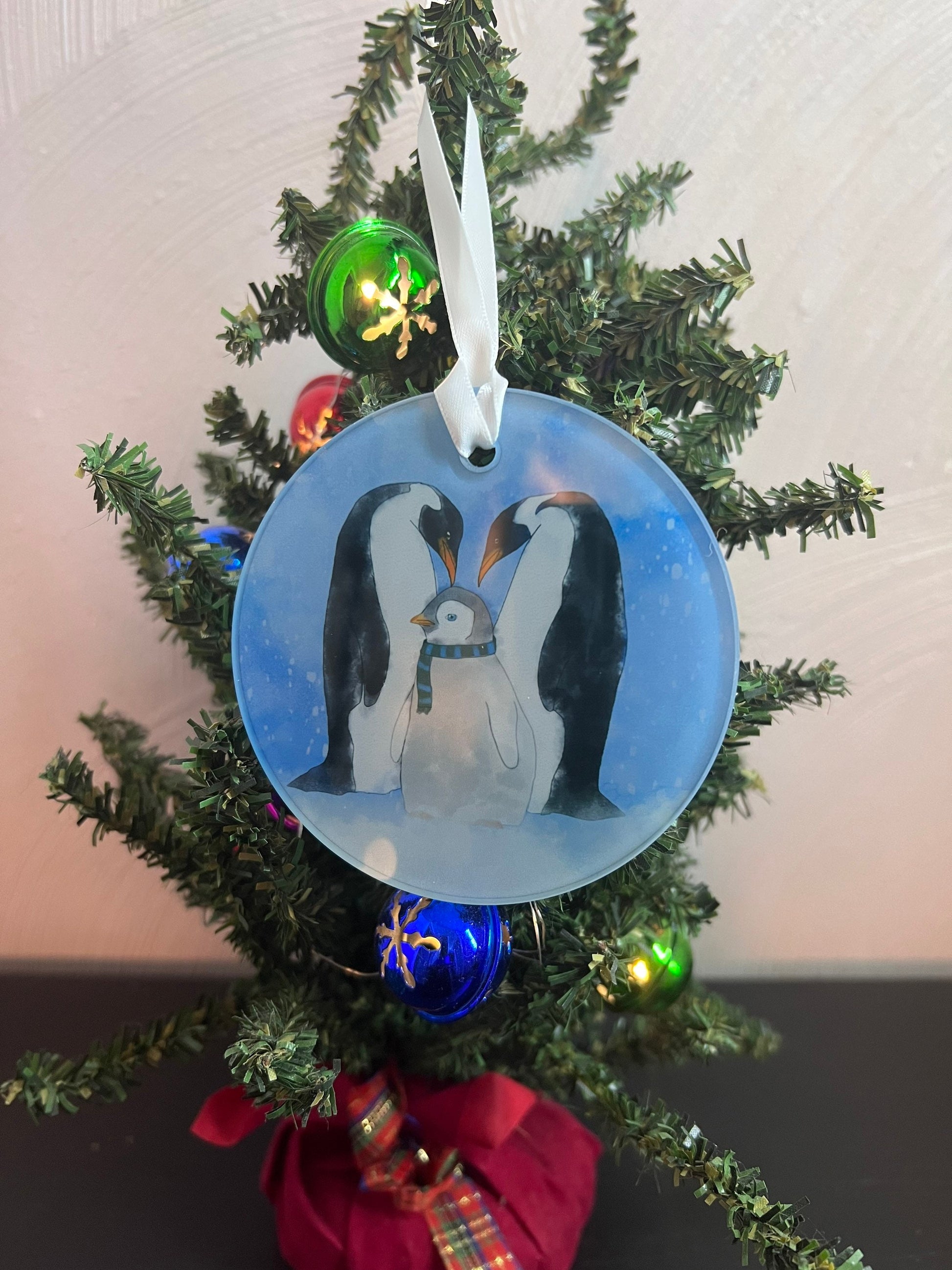 This beautiful 3.5” glass ornament has an adorable penguin family!