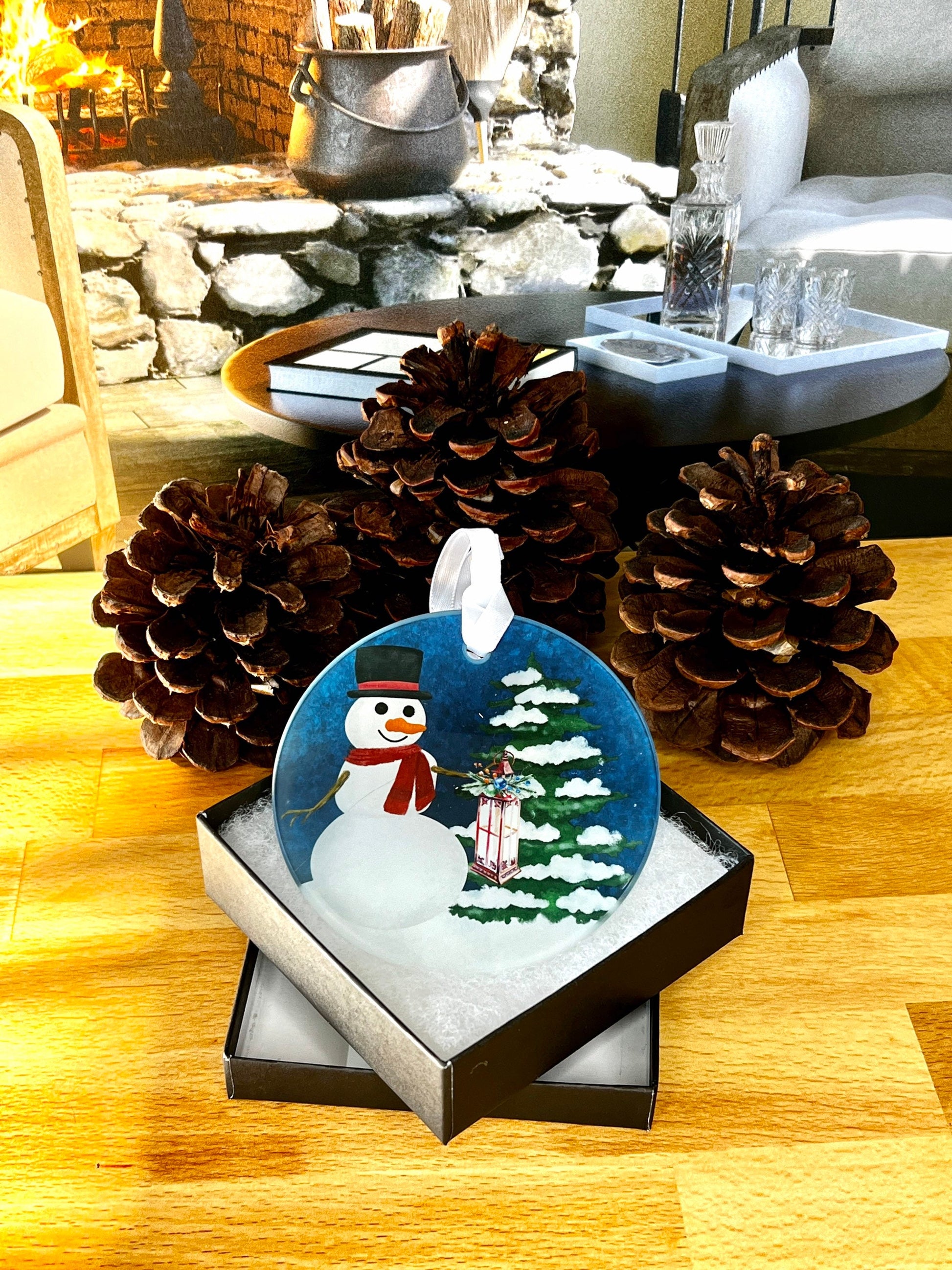 Snowy Tree and Snowman Scene Glass Ornament / Suncatcher
