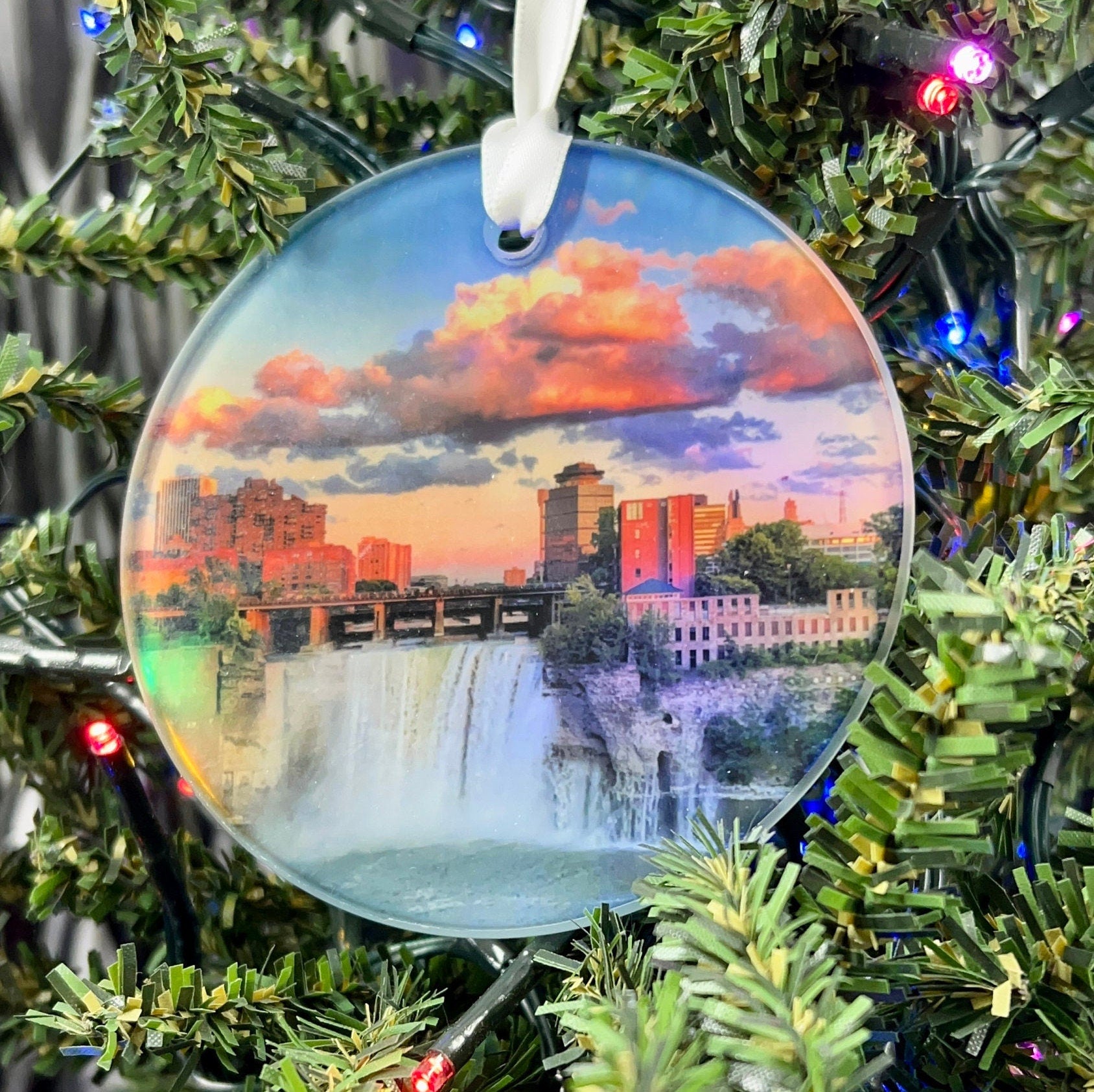 This beautiful 3.5” glass ornament showcases everyone's favorite view of High Falls at Sunset in Rochester, NY!
