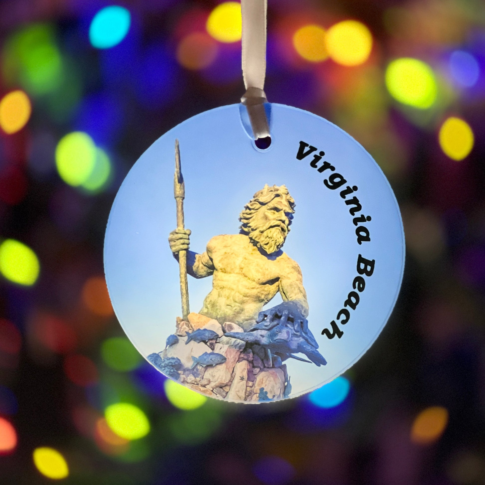 This beautiful 3.5” glass ornament showcases a Sunset at the Statue of King Neptune, Virginia Beach, VA!