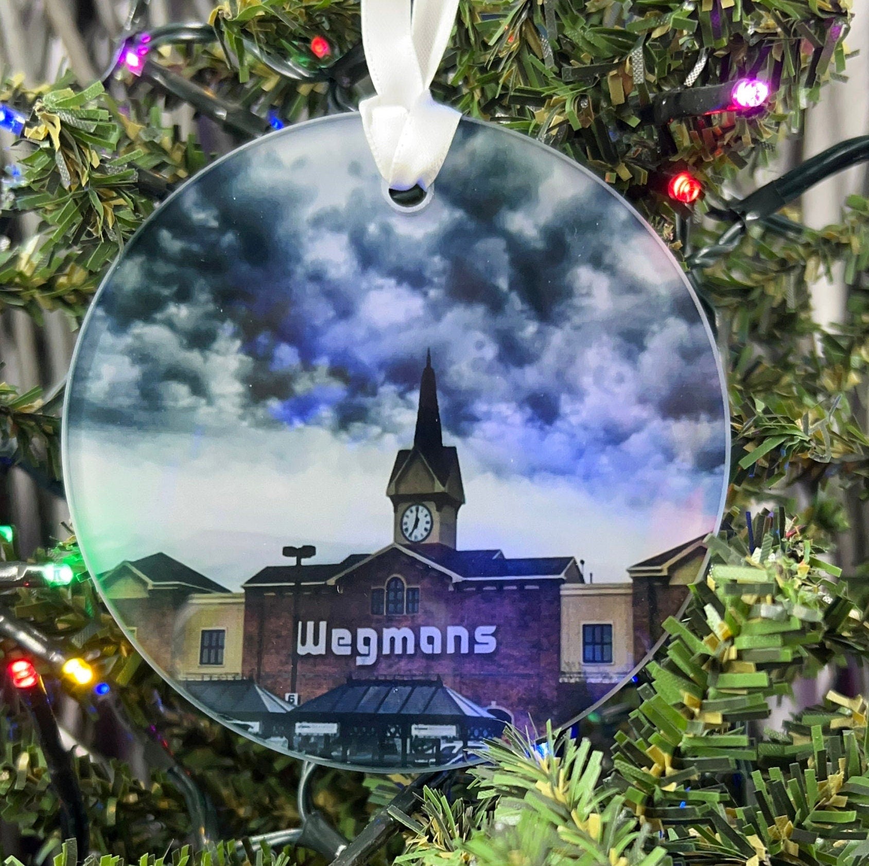 This beautiful 3.5” glass ornament with a white ribbon showcases everyone’s favorite grocery store, Wegmans!